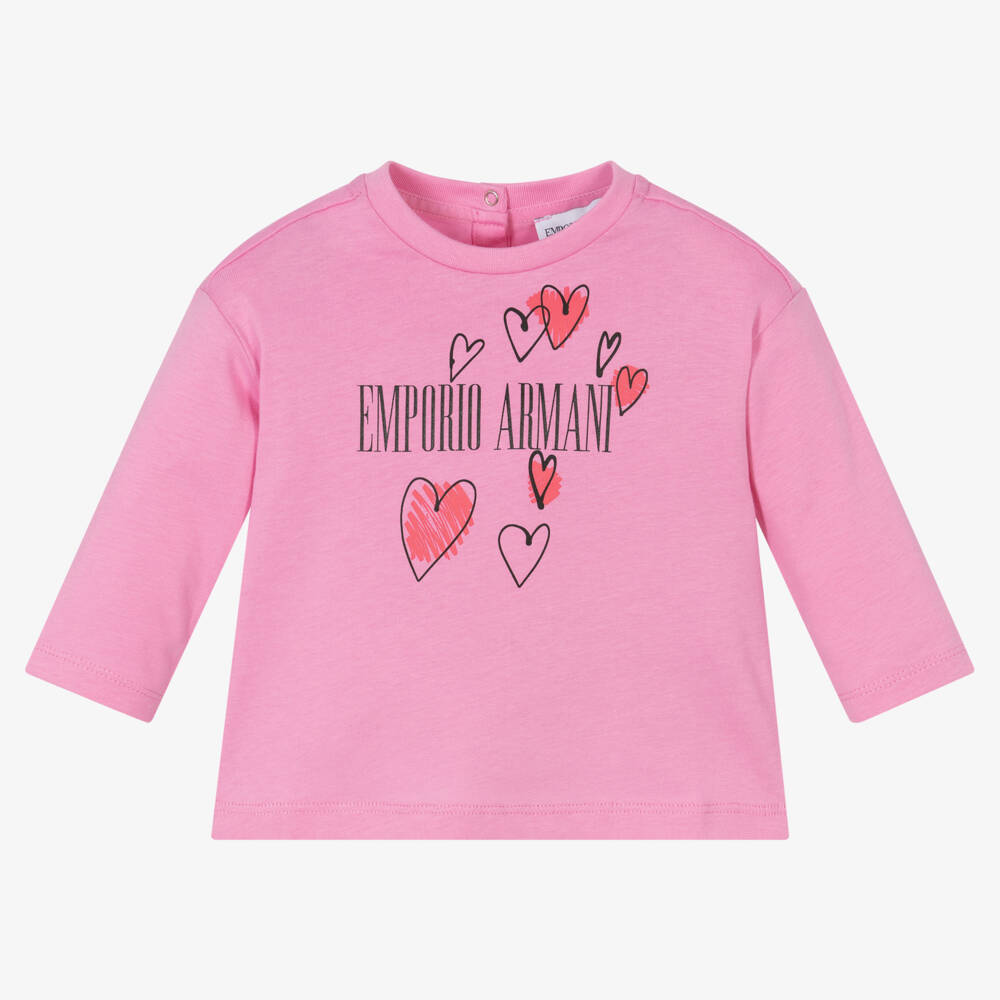 Casual long-sleeved pink top for little girls by Emporio Armani, made in soft and stretchy cotton jersey. It has a love heart themed logo print on the front and a gently ribbed crew neck. There are popper fastenings on the back of the neck to help with dressing.