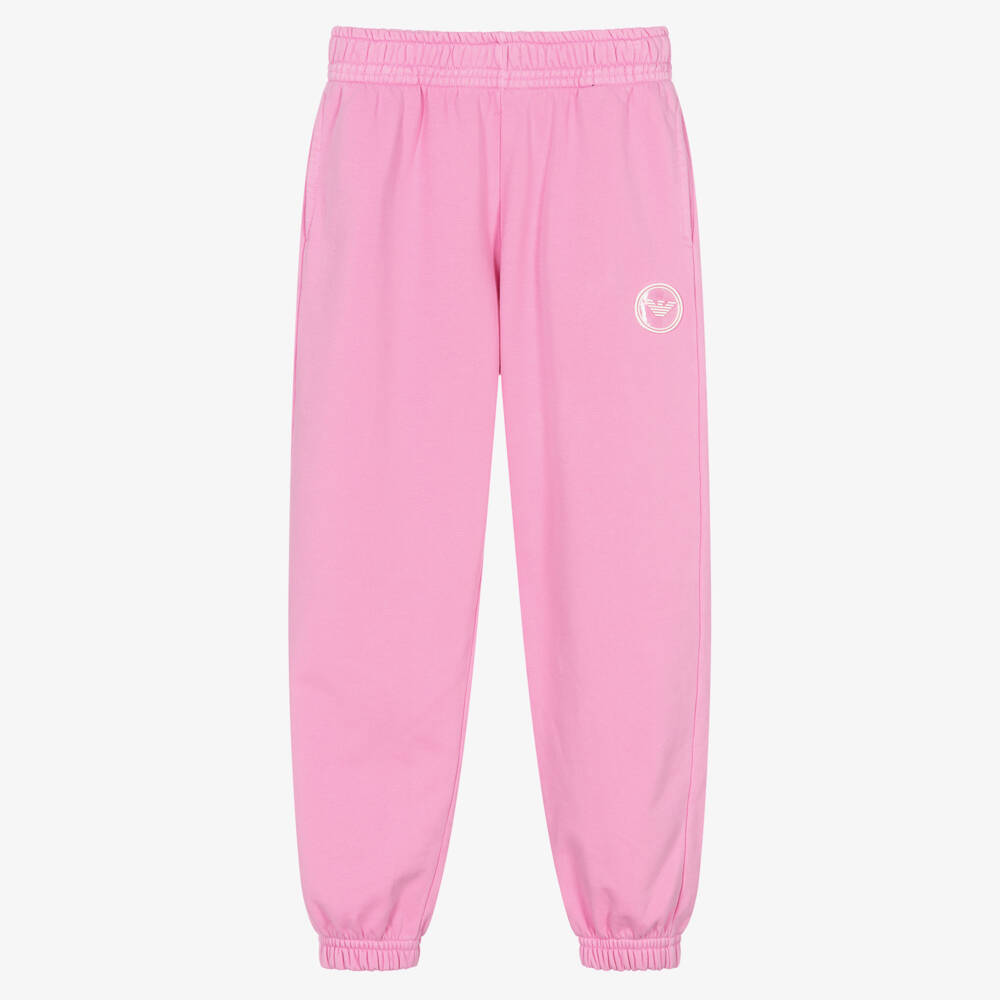 Pink joggers for girls by Emporio Armani, made from a mid-weight cotton jersey blend with a soft, fleecy inside. Designed with a rubberised Eagle logo on the leg, these casual bottoms have side seam pockets and elasticated cuffs. They have an elasticated waist for comfort and easy movement.