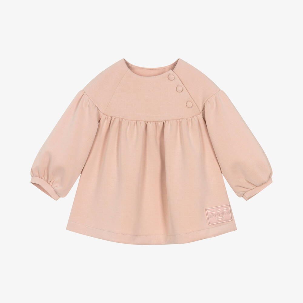 A lovely pale pink dress for little girls by Italian brand Emporio Armani. It is made in a super soft modal-blend jersey, with puffed long sleeves and a full, gathered skirt. There are fabric covered button fastenings on the raglan sleeves, and a tonal embroidered logo badge near the hem for a designer touch.
