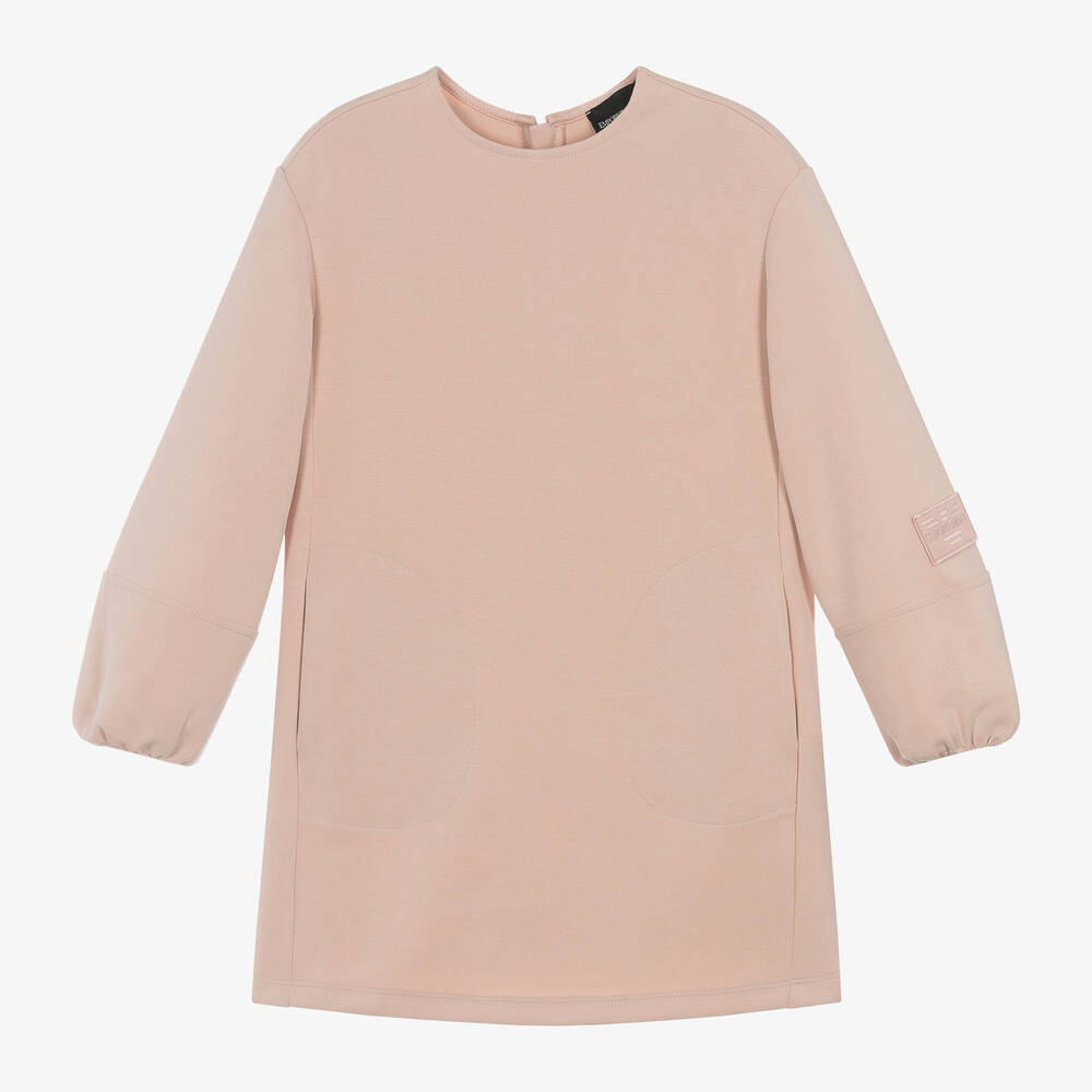 A lovely pale pink dress for girls by Italian brand Emporio Armani. It is made in a super soft modal-blend jersey, with puffed long sleeves and concealed side seam pockets. A tonal embroidered logo badge on one sleeve adds a finishing designer touch.