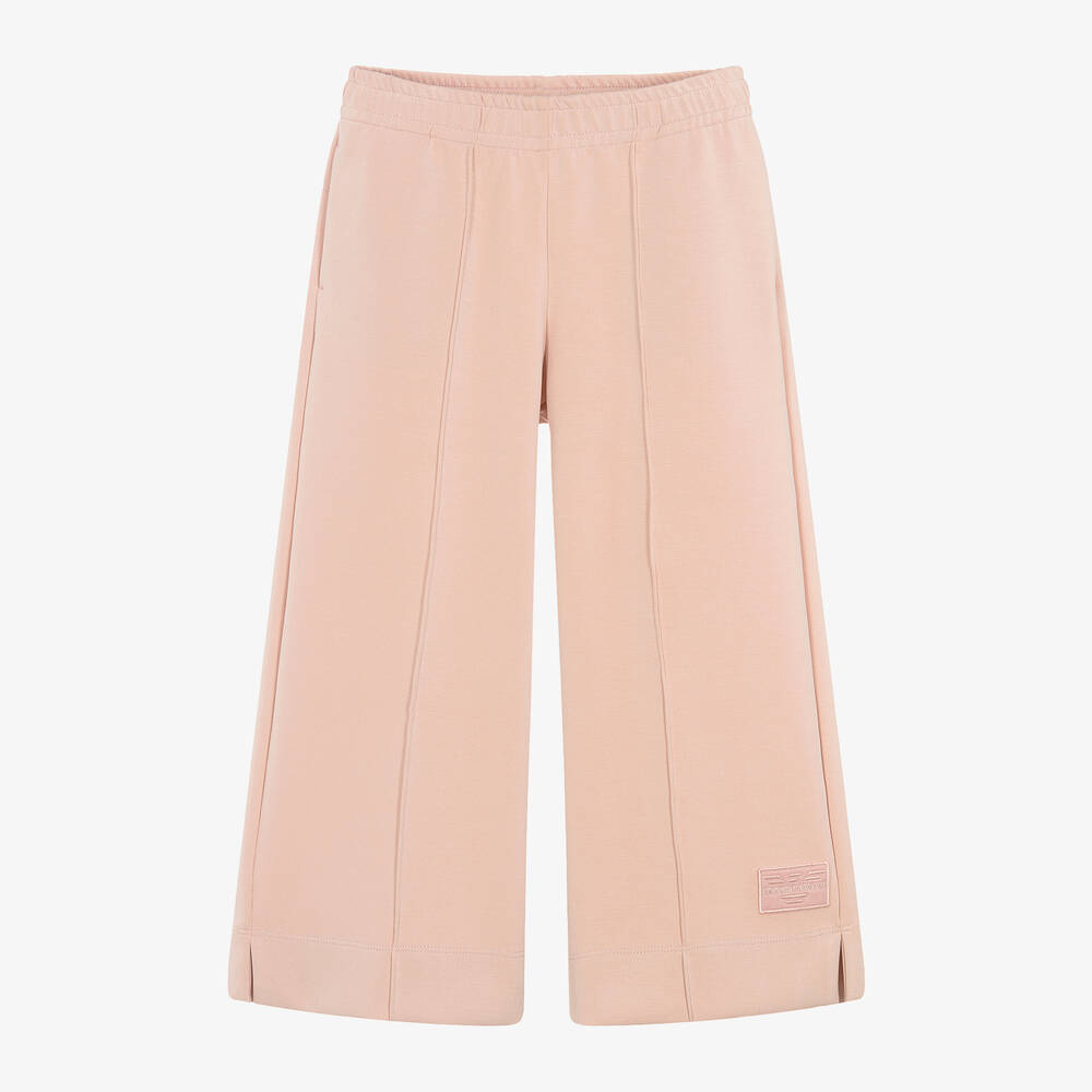 Casual yet stylish, these pale pink wide-leg joggers for girls are by Italian brand Emporio Armani. They are made in a beautifully soft, modal-blend jersey, with seams down the front. They have an elasticated waist for a comfortable fit, with concealed side seam pockets and vented hems. A tonal embroidered logo badge on one leg adds a finishing designer touch.