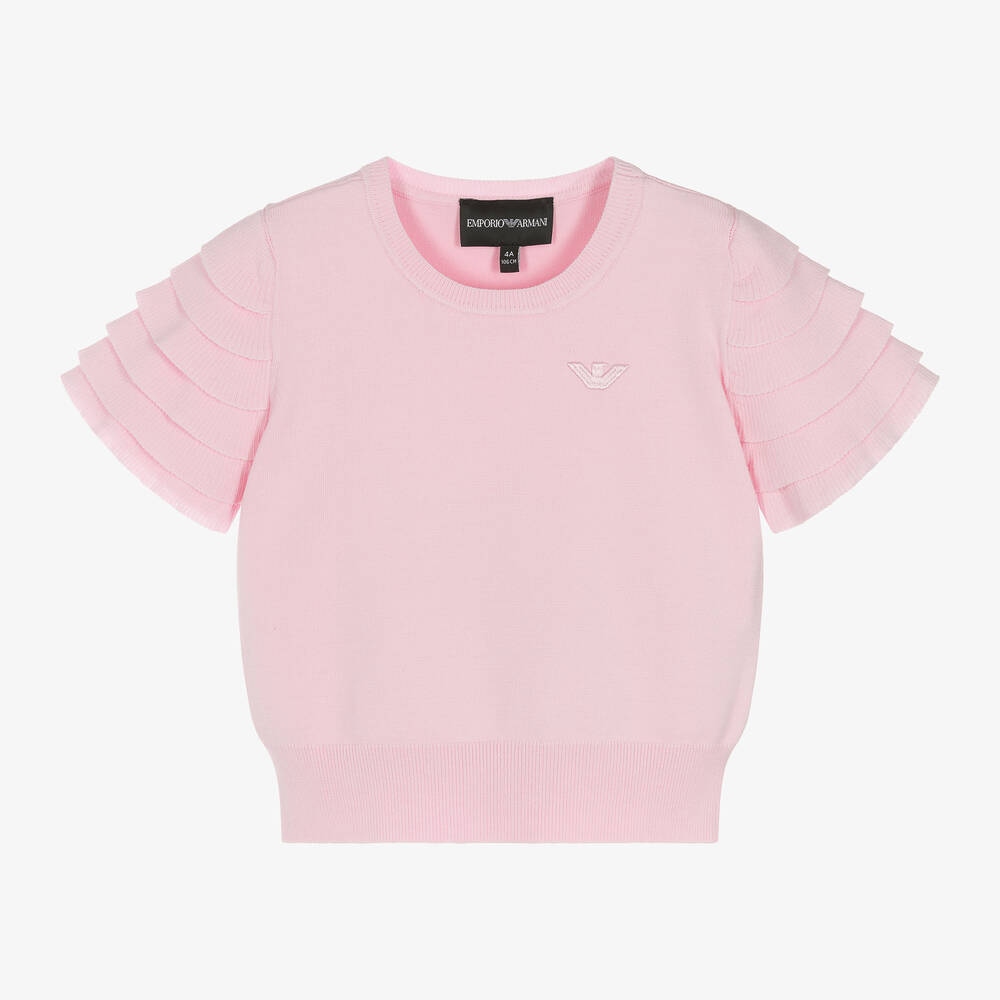 A lovely light pink knitted T-shirt for girls from Emporio Armani, made in a luxury viscose blend for softness and comfort. This sweater-style top has pretty, tiered ruffles in ribbed knit covering the short sleeves for a girly look. The Italian brand's iconic Eagle logo is embroidered on the chest.