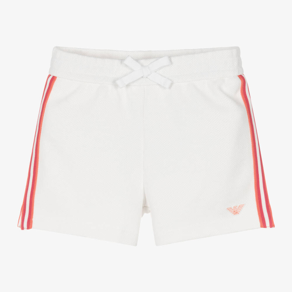 Casual off-white shorts for girls, part of the EA Crew capsule by Italian brand, Emporio Armani. Made from cotton in a soft and stretchy waffle-knit jersey, they have red and orange striped tape trims on the sides for a sporty vibe. For an instant iconic look, the rubberised Eagle logo can be seen by the side vent. Easy to pull on, they have an elasticated waistband with a fixed bow on the front.