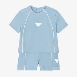 Ivory and green striped shorts set for younger boys and girls by Emporio Armani, made in a lightweight blend of cotton and linen. Designed with a revere collar, the shirt has a chest patch pocket, embroidered with a shimmery EA logo. With matching branding, the shorts are simply styled with a comfortable elasticated waistband.