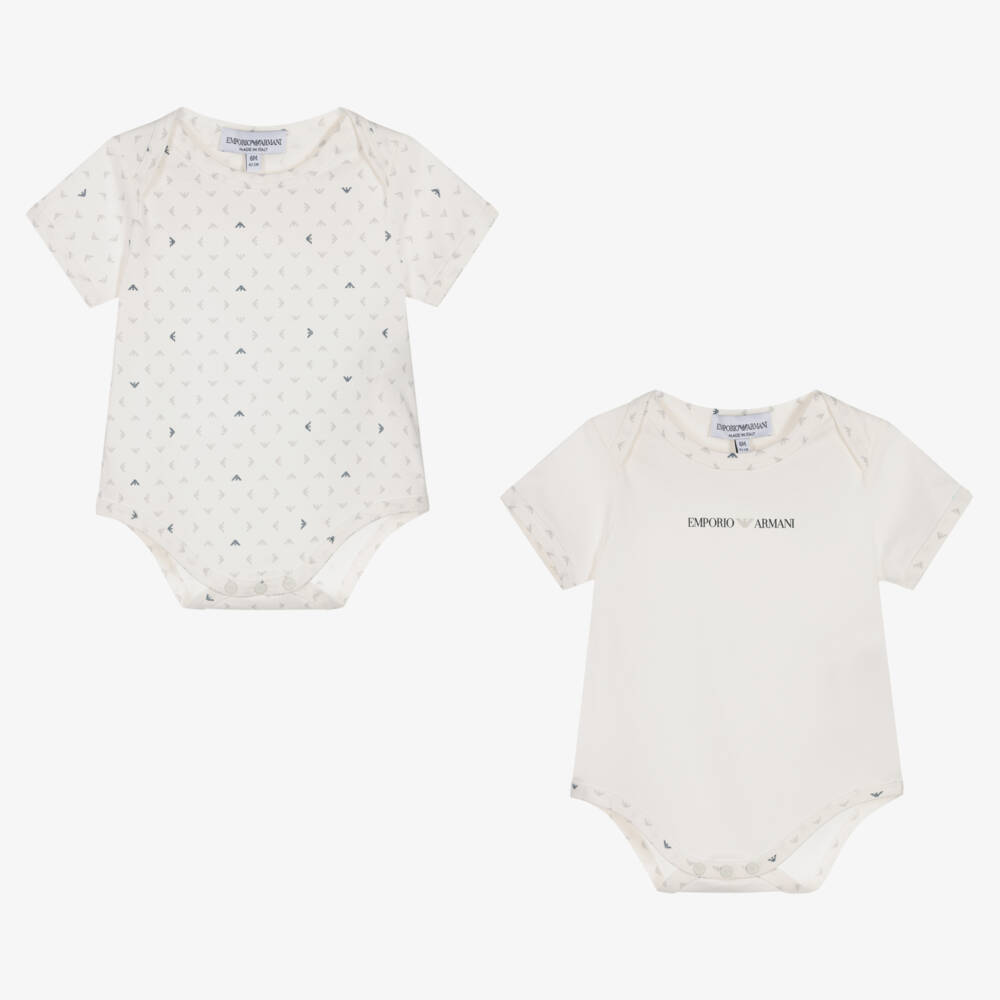 Pack of two ivory bodyvests for baby boys and girls by Emporio Armani, made in soft cotton jersey. Instantly recognisable, one is finished with the Emporio Armani logo on the chest with classic Eagle logo trims. The other is patterned in an all-over Eagle logo print in shades of blue and grey. Both have branded popper fastenings between the legs, making changing effortless.