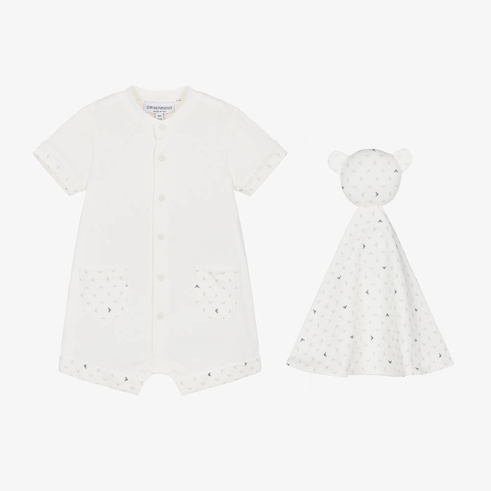 Adorable ivory shortie and doudou set for baby boys and girls by luxury Italian designer Emporio Armani. Made in super soft cotton jersey, the cute one-piece has grey and navy blue Eagle logo trims on the turned-up cuffs and patch pockets. It fastens with branded poppers on the front and between the legs for easy changing. A sweet teddy doudou comforter with a matching Eagle logo pattern completes this lovely gift set.