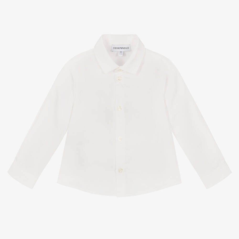 Smart ivory shirt for baby boys by Emporio Armani, made in lightweight cotton sateen. It has signature Eagle and r-EAcreate logos patterned in the weave and it fastens with branded buttons.