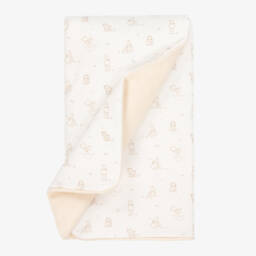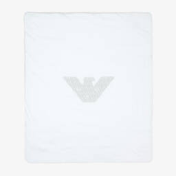 Ivory blanket for baby boys and girls by Italian brand Emporio Armani. Made in soft cotton jersey, it has the brand's logo printed on the front in black, with the reverse patterned in grey Eagle logos for a distinctly designer look. Softly padded, it is ideal for use in the pram when out and about or as a comfortable surface for baby to lie on.