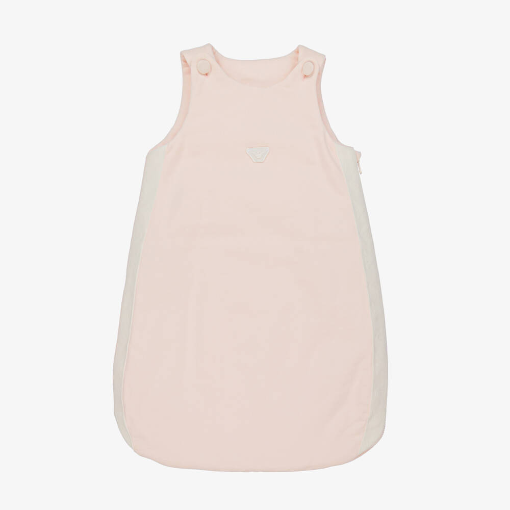 Pale pink sleeping bag for baby girls, by Emporio Armani, made from soft cotton jersey. Comfortable and padded, it has the brand's white logo tape down the sides, and the iconic Eagle logo appliqué on the front in white. It fastens with useful buttons on the shoulders, and a zip fastening on the side for easy dressing.