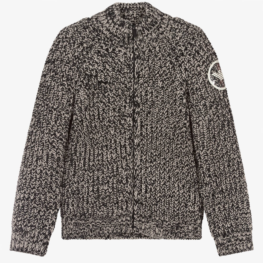 A black and grey wool-blend zip-up top for teen boys by luxury brand Emporio Armani, featuring a rubberised Eagle logo badge. This chunky ribbed knit cardigan has a zip fastening on the front, making it great for layering on colder days.