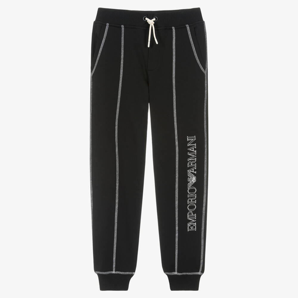 Black joggers for teen boys from Italian label Emporio Armani. These cool joggers are designed with contrast white topstitching and an embroidered logo on one leg for added designer appeal. With useful side pockets, they feature a stretchy ribbed waistband, with a white branded faux drawstring detail. Super soft, they are made in mid-weight organic cotton jersey, with a soft fleecy-feel inside for added comfort and warmth.