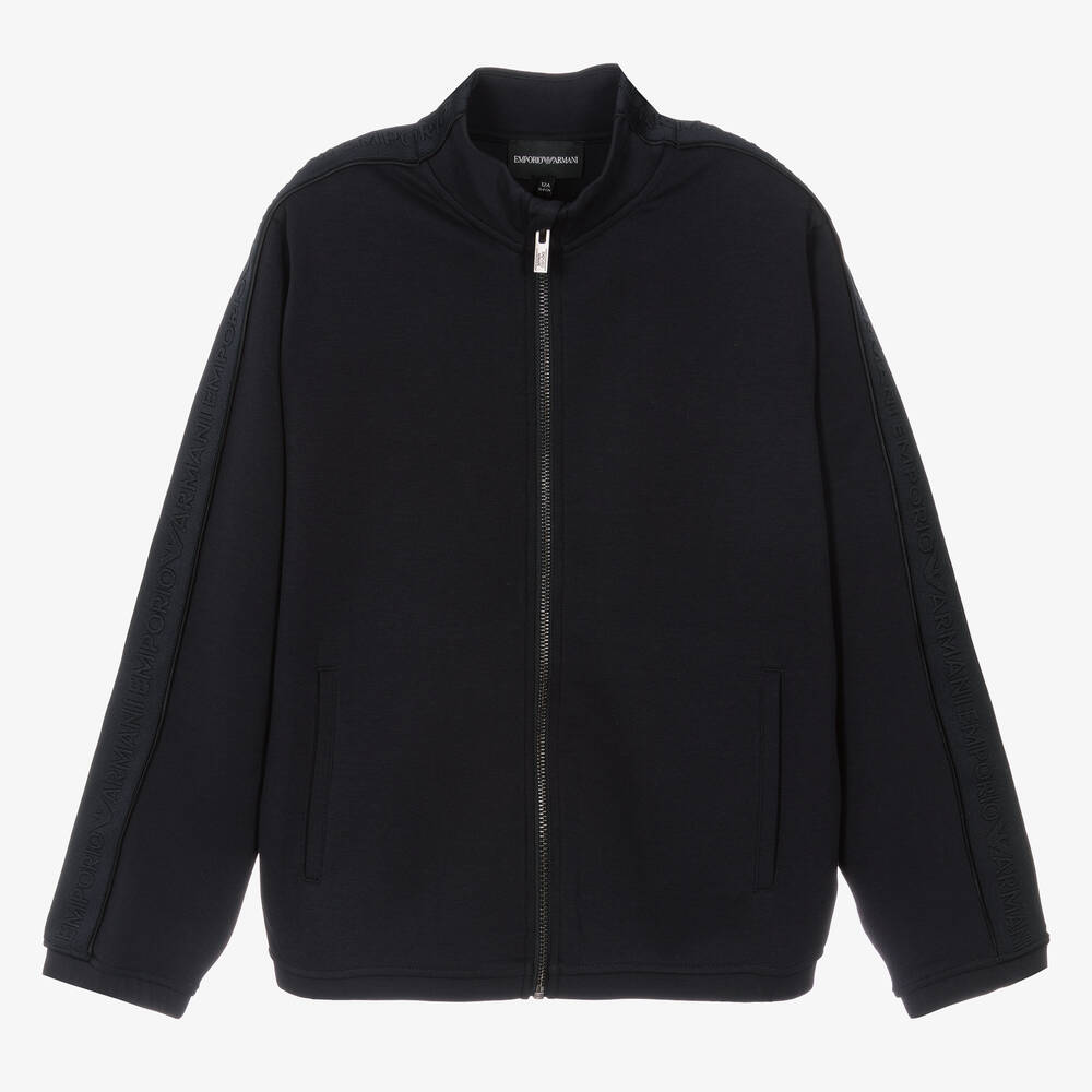 Navy blue zip-up top for teen boys by Italian brand Emporio Armani. For a sporty designer look, it has tonal jacquard logo tape on each long sleeve and shoulder. Ideal for layering, it is made in super soft, mid-weight cotton-blend jersey with front pockets and a zip fastening with a useful chin guard.