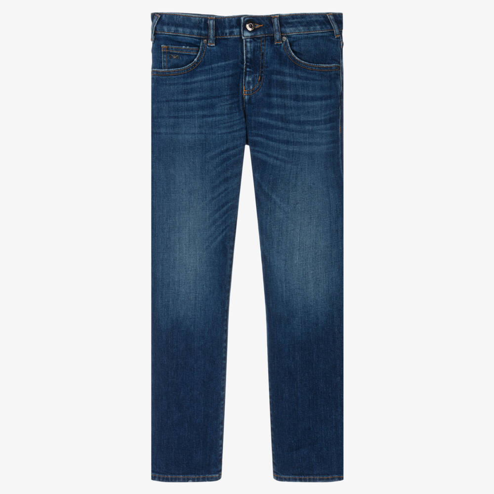 Mid-blue cotton denim jeans for teen boys by luxury brand Emporio Armani, with signature metal Eagle logos on the front and back pockets. These designer jeans have a classic straight-leg fit, with washed-effect knees for a modern finish. They fasten with a branded button and zip.