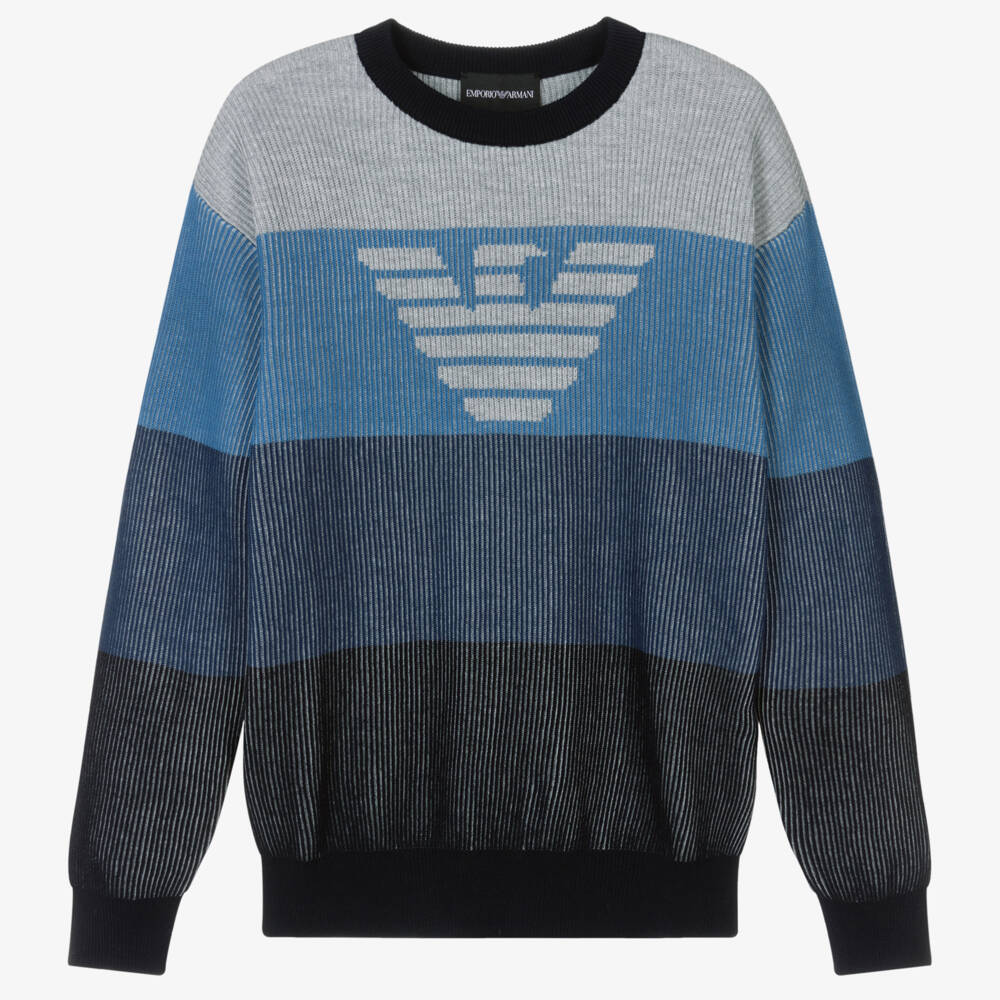 Undeniably Emporio Armani, blue and grey striped jumper for teen boys with the iconic Eagle logo on the chest. This timelessly styled jumper is knitted in fine ribbed cotton for comfort and warmth.