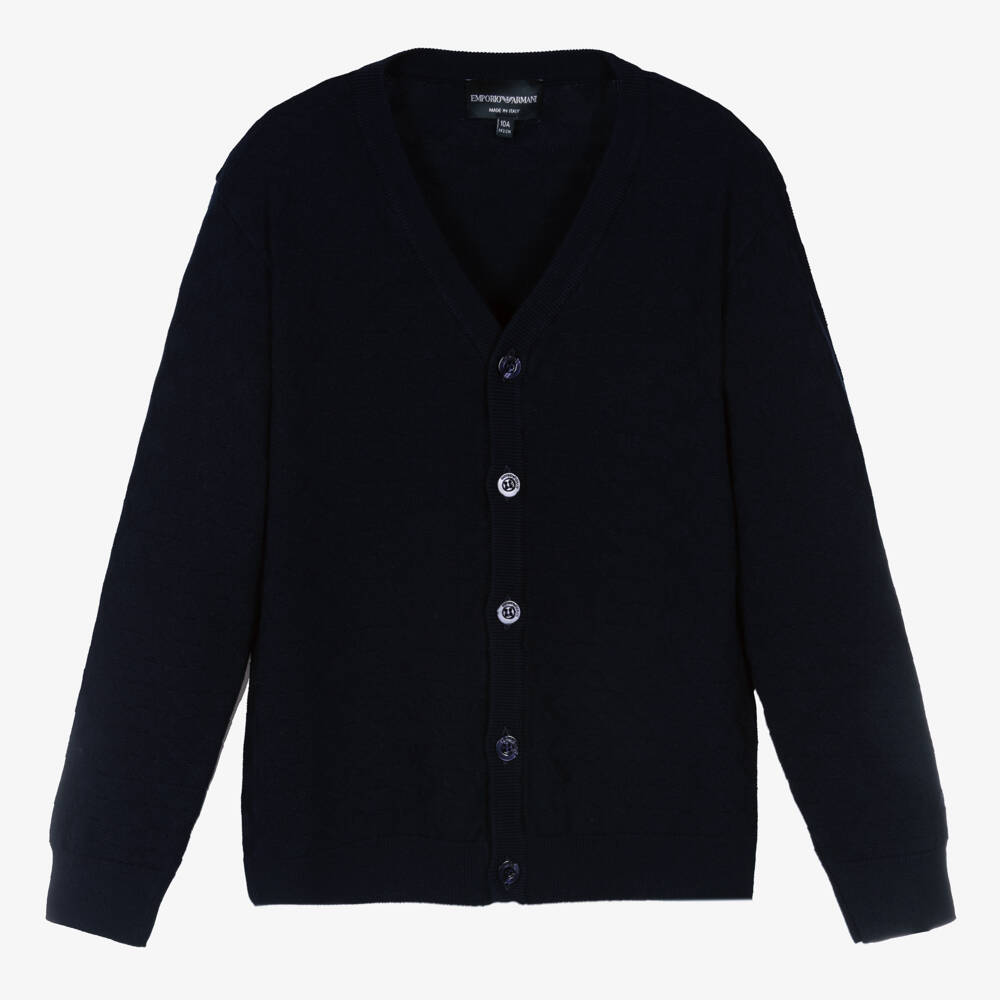 From Emporio Armani, intarsia Eagle logo knitted navy blue cardigan for teen boys. It is stylish with a V-neck, ribbed trims, and branded button fastening on the front whilst the soft knit is comfortable and ideal for layering.