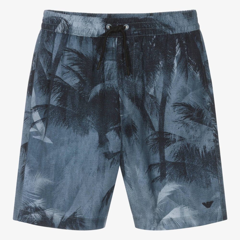 Cool and casual navy blue shorts for teen boys by Italian label Emporio Armani, inspired by the adult collection. Patterned with palm tree graphics, they have the iconic Eagle logo embroidered by the hem for a signature look. Woven in lyocell, they are smooth and lightweight to wear in warm weather. There are neat pockets on the side seams, two back pockets and an elasticated waistband with a faux drawstring to tie on the front.