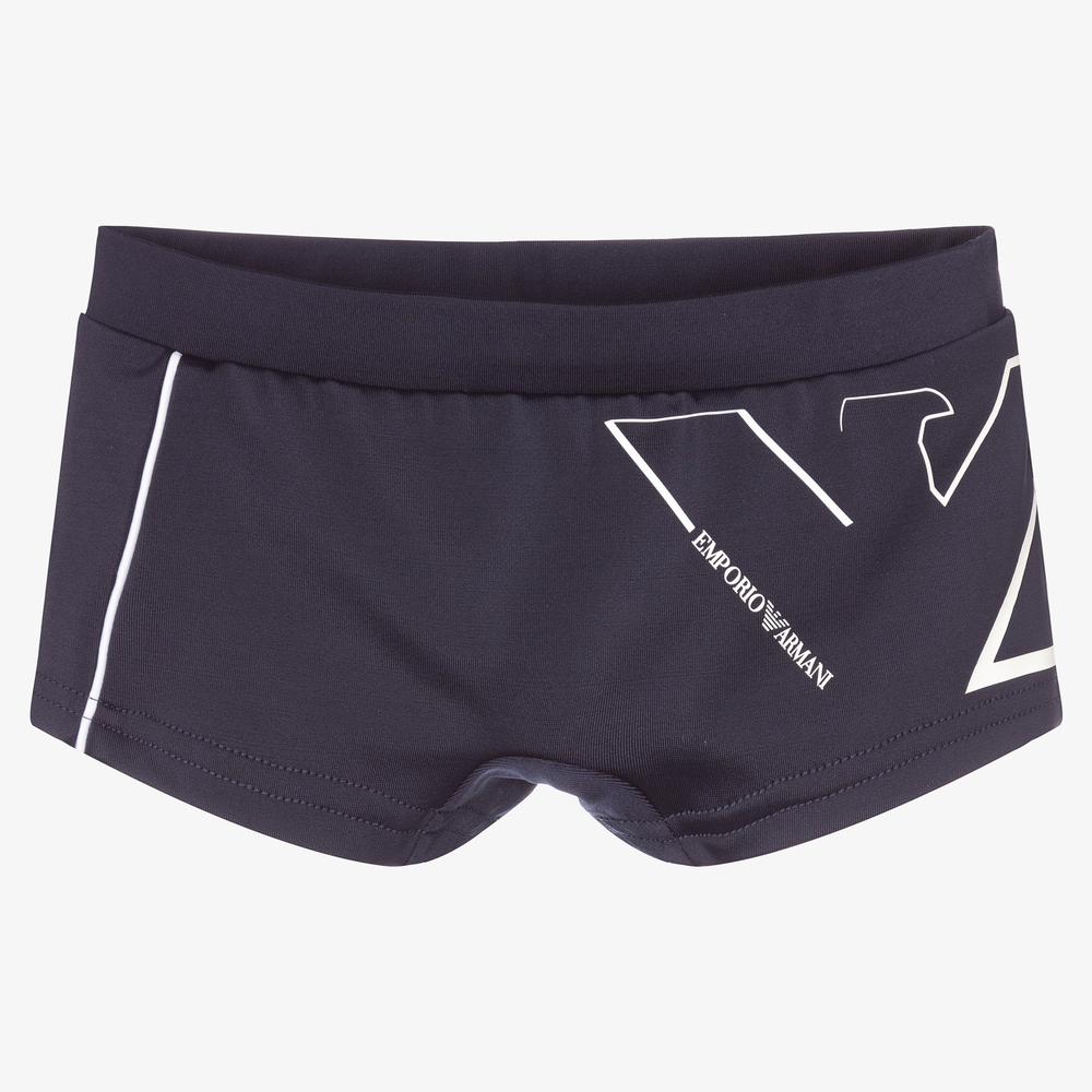 Navy blue swimming trunks for teen boys by Emporio Armani, made in soft and silky polyester. Fully lined, they have a white Eagle logo print on the front.
