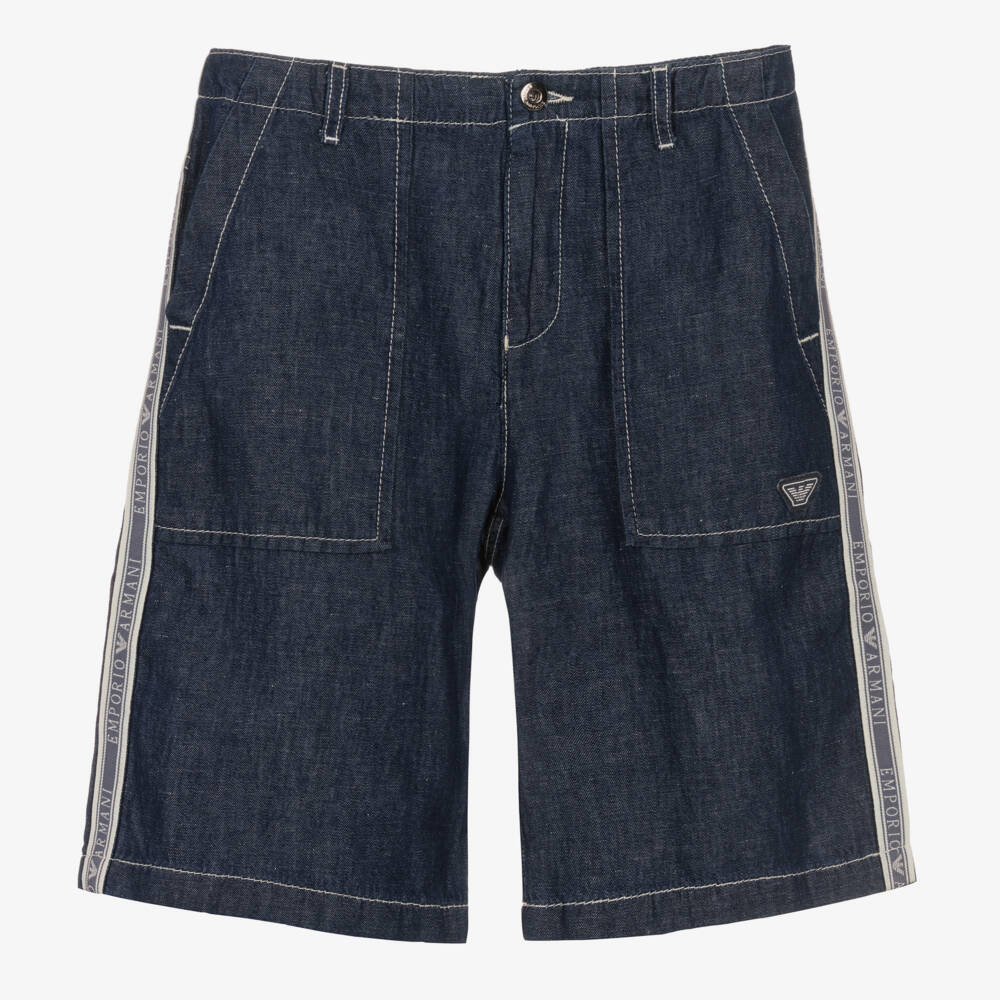Designed to resemble denim, these dark blue chambray shorts for teen boys are by Italian label Emporio Armani. Easy and effortless to style, they have distinctive logo tape trims on the sides and the iconic Eagle logo patch on one leg. Deep front pockets, paired with a single back pocket, help to keep small valuables within reach. Knee length, they are made in a lightweight cotton and linen blend and fasten with a button and concealed zip on the front.