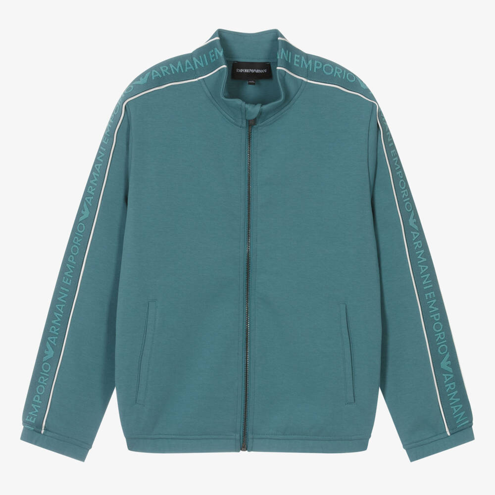 Teal green zip-up top for teen boys by Italian brand Emporio Armani. For a sporty designer look, it has tonal jacquard logo tape on each long sleeve and shoulder with white piping trims. Ideal for layering, this long-sleeved top is made in super soft, mid-weight cotton blend jersey with front pockets and a zip fastening with a useful chin guard.