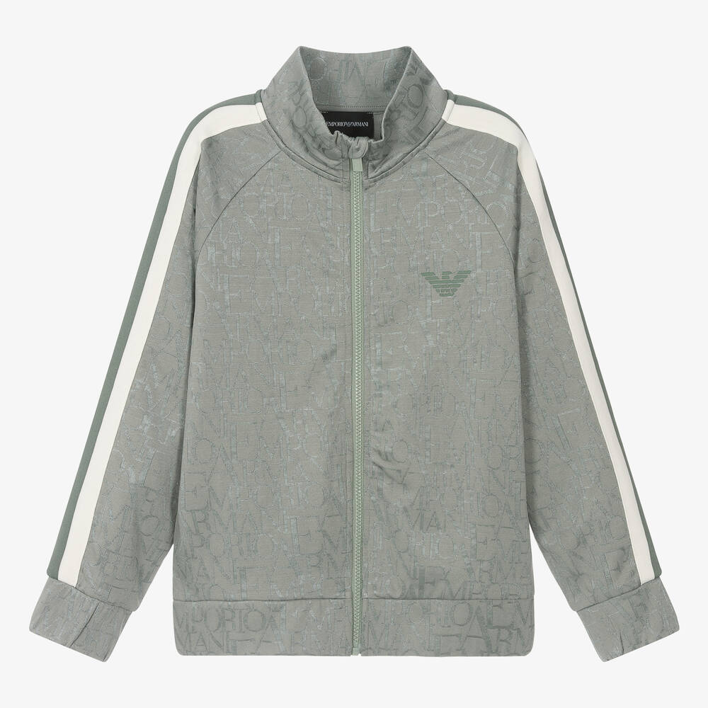 Teen boys light khaki green zip-up top by Emporio Armani, with a stylish logo jacquard design. Made in soft jersey, this sporty style has striped taped trims down each of the long sleeves, with a rubberised Eagle logo on the chest adding an extra designer detail. The casual look is completed with useful pockets on the sides and a branded zip fastening.