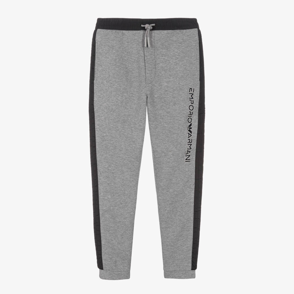 Essential grey marl joggers for teen boys by Emporio Armani, embroidered with the Emporio Armani logo on one leg. Designed with silky, black nylon trims, these soft jersey joggers have useful side pockets and narrow cuffs. There are fixed drawstring ties on the elasticated waist for a custom fit.