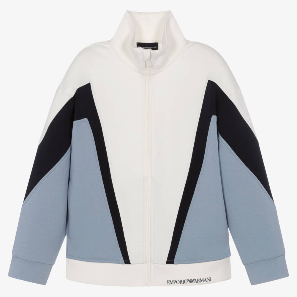 Cool retro-inspired ivory track top for teen boys by Emporio Armani, with tonal blue colourblock trims. The hem is printed with the designer's iconic spell-out and Eagle logo for instant designer appeal. Luxury meets casualwear with this zip-up top, crafted in luxuriously soft Milano jersey with a logo-embossed zip.
