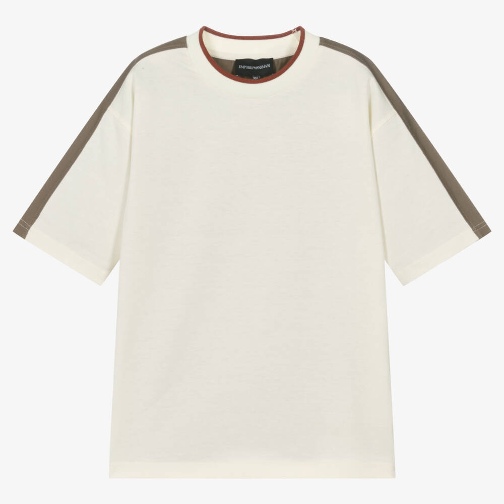 A colourblock T-shirt for teen boys by Italian brand Emporio Armani, in earthy tones of ivory, taupe and brown. Great for casual wear, this designer tee has an oversized Emporio Armani logo embroidered on the back in white. It is made in comfortable cotton jersey, with a lightly ribbed crew neck.