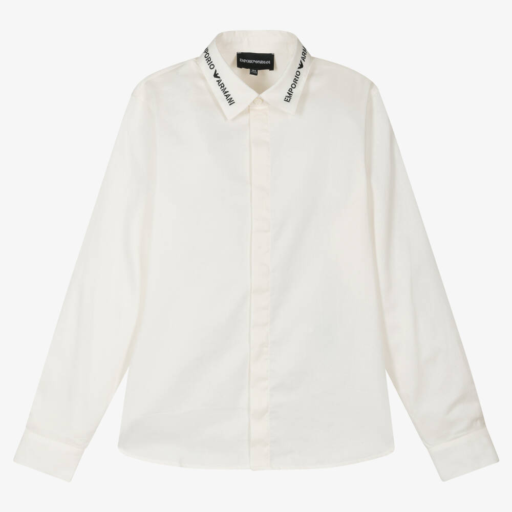 A timeless ivory cotton poplin shirt for teen boys from luxury Italian designer Emporio Armani. A navy blue Emporio Armani logo is embroidered on the collar for a bold, contemporary finish. It has a neatly concealed button fastening placket on the front.
