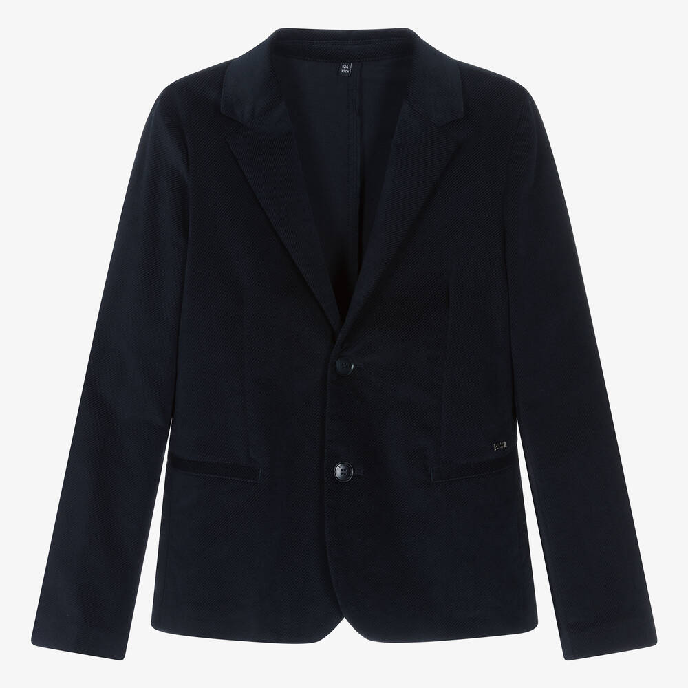 Smart-casual navy blue corduroy jacket for teen boys by iconic Italian designer Emporio Armani. Made in soft cotton and slightly fitted, it has useful front pockets, one with a subtle pewter-coloured metal Eagle logo tab above it. It fastens with logo buttons on the front and cuffs, and is vented at the back.