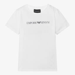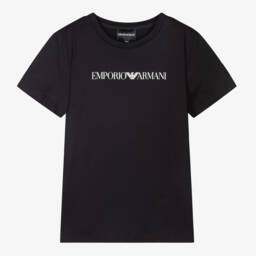 Teen boys navy blue T-shirt by Emporio Armani, made in soft cotton jersey and styled with short sleeves. Full of branded appeal, it has a white Emporio Armani logo printed on the front, alongside the iconic Eagle, for an unmistakable look.