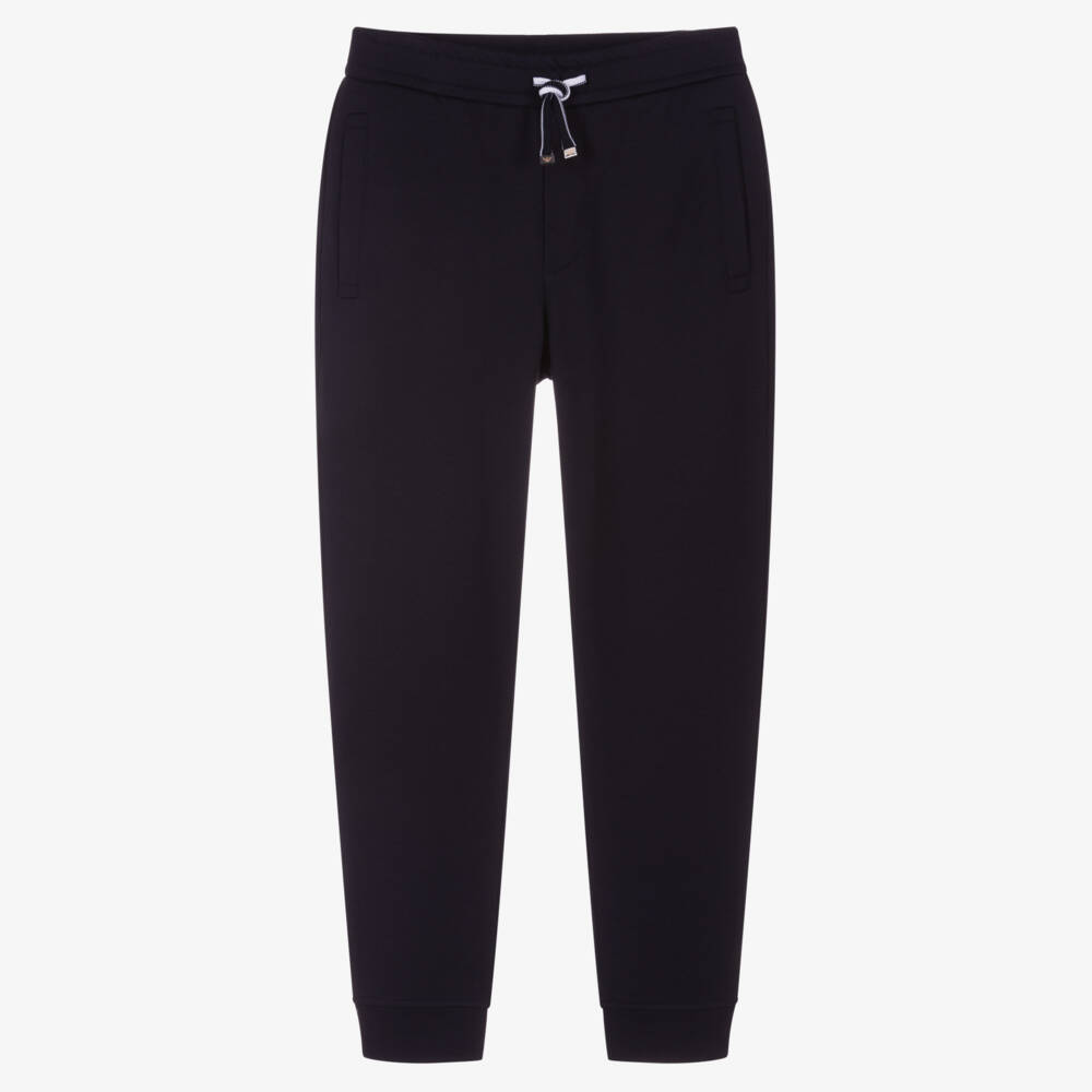 Navy blue joggers for teen boys by luxury brand, Emporio Armani. Made in a super soft blend of modal and cotton for supreme comfort. There are faux side and back pockets and a white silicone Eagle logo on the back. The elasticated waistband has a faux drawstring with Eagle logo branded tips.