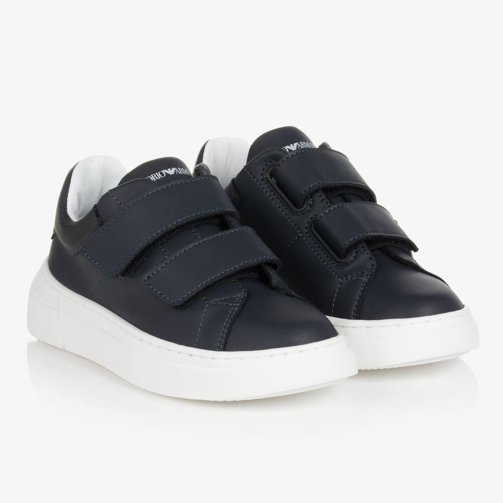 Navy blue leather trainers for teen boys from Emporio Armani. Great for pairing with casual outfits, these signature shoes have a tonal Eagle logo print on the heel and a distinctive Emporio Armani logo across the tongue in white. Fastening with velcro straps, this comfortable style has a panelled lining which combines smooth leather and soft cotton twill. The chunky, non-slip soles are treaded for improved grip.