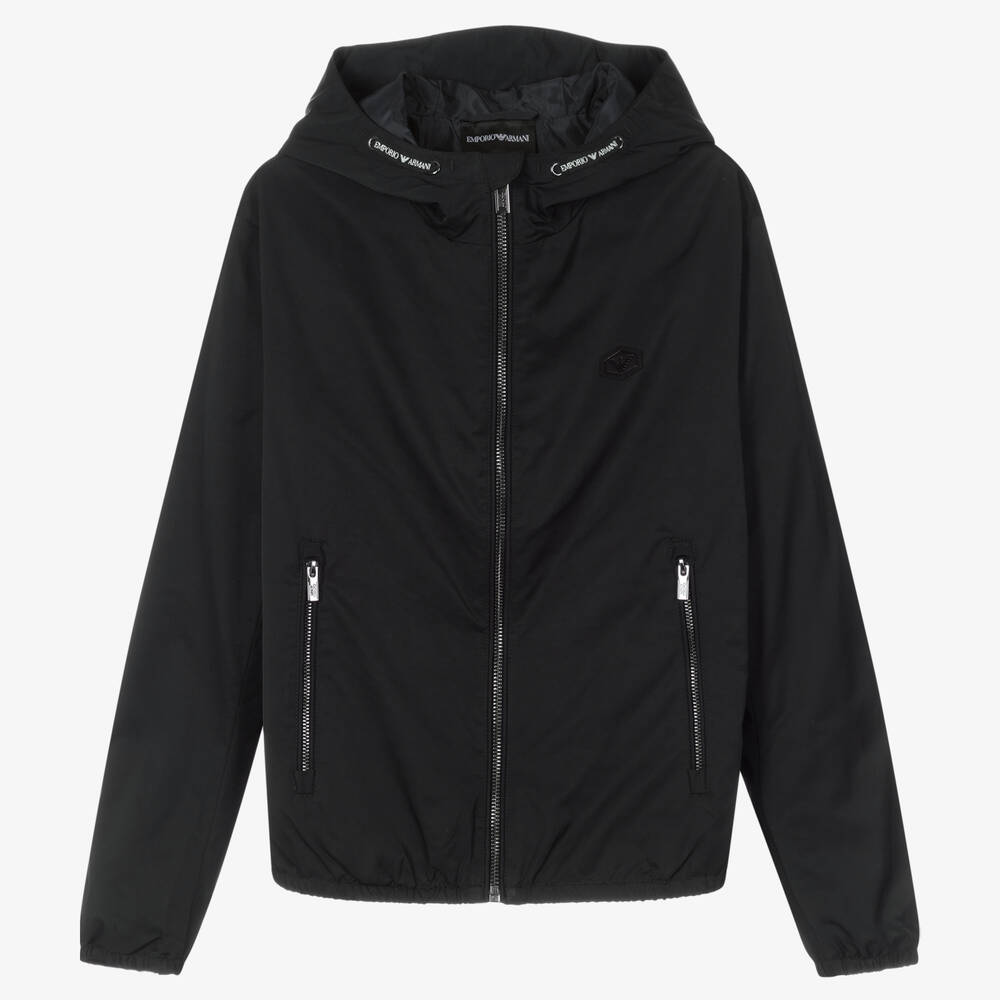 From luxury brand Emporio Armani, navy blue windbreaker jacket for teen boys with the iconic Eagle logo on the chest for brand recognition. For an added designer touch, this lightweight boxy jacket fastens with logo-embossed zips and has logo-printed faux drawstrings on the hood. Ideal for wearing in cooler, wet weather it is made in double-layer of water-repellent micro twill with elasticated trims to keep the warmth in.