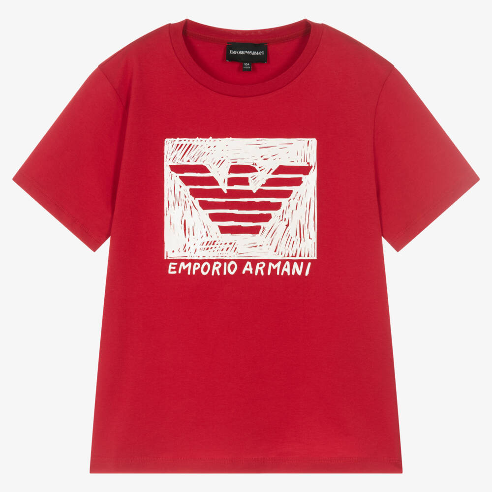 Teen boys red graphic T-shirt, by luxury designer Emporio Armani. Inspired by the brand's instantly recognisable logos, this cotton style has a white Eagle logo artwork on the front in an edgy sketched design. This branded tee contains recycled and organic fibres.