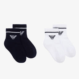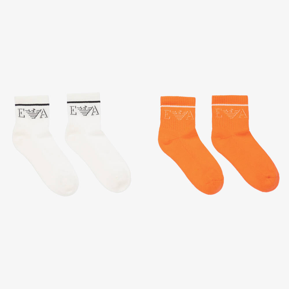 Pack of two sporty ankle socks for teen boys by Italian designer Emporio Armani. In white and orange, they are made in a soft cotton blend with cushioned soles for extra comfort and absorbtion. They have logo detailing around the ankles in black and white.