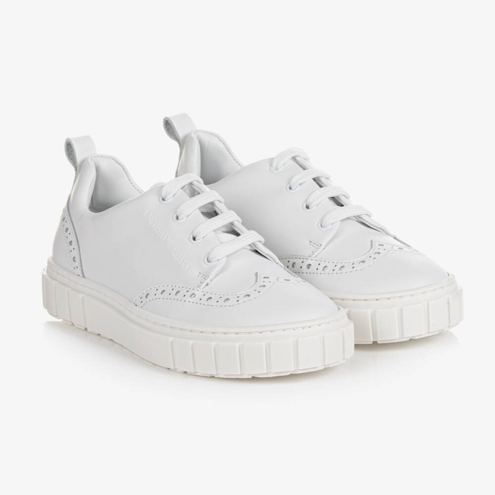 Smart white leather trainers for teen boys, by luxury brand Emporio Armani. Italian made, they offer the classic brogue a contemporary update, with chunky white rubber outsoles and a pull tab on the back. For a branded touch, they are embossed with the iconic logo on the sides and inside the smooth leather insole. They fasten with neat laces and upgrade any cool outfit with their modern aesthetic.