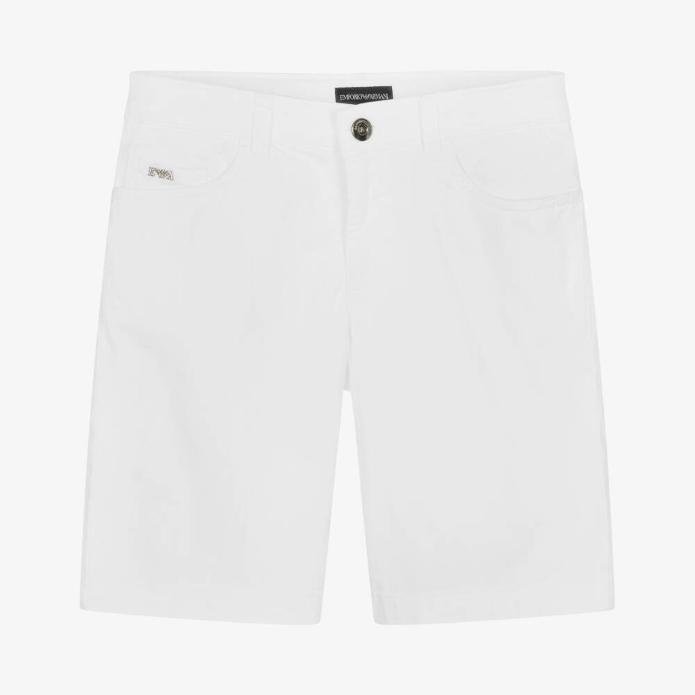 White shorts for teen boys by Italian brand Emporio Armani, complete with their signature Eagle metal logo on the back pocket. Made in smooth and lightweight cotton, these versatile shorts have five-pocket detailing and a zip and button closure. An Emporio Armani metal logo plate can also be seen on the front for an added designer detail.