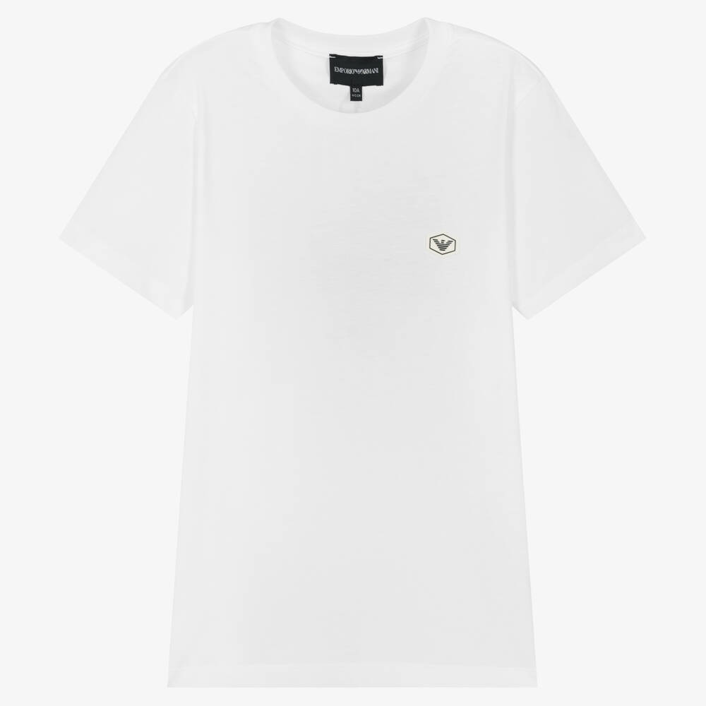 Classic white T-shirt for teen boys by luxury brand Emporio Armani. The designer's silicone Eagle logo badge is positioned at the chest. In a regular fit, it is made in soft cotton jersey.