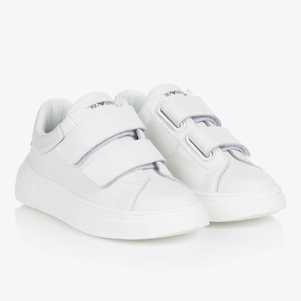 White leather trainers for teen boys from Emporio Armani. Great for pairing with casual outfits, these signature shoes have a tonal Eagle logo print on the heel and a distinctive Emporio Armani logo across the tongue in navy blue. Fastening with velcro straps, this comfortable style has a panelled lining which combines smooth leather and soft cotton twill. The chunky, non-slip soles are treaded for improved grip.