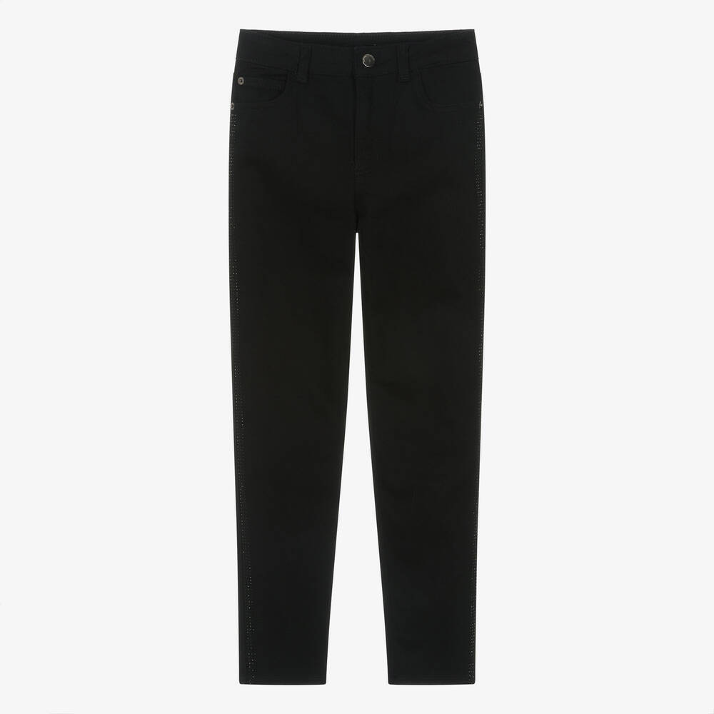 Cool and casual, these black skinny jeans for teen girls are by Italian brand, Emporio Armani. A modern twist on a classic wardrobe staple, they have black diamanté embellishments on the sides and the reverse, for a hint of glamour. An iconic pewter-tone Eagle logo can be found on one back pocket for a signature finish. Made from mid-weight cotton denim, they fasten with a zip and branded button on the front.