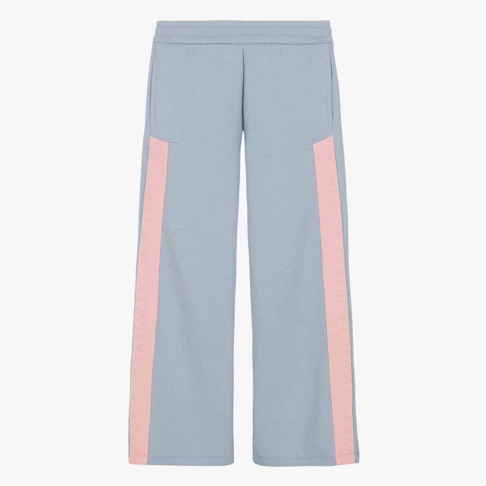 Cool pale blue joggers for teen girls by Italian designer Emporio Armani, ideal for relaxing in style. For instant brand recognition, they have pink tape along the legs, embossed with the designer's logo. Made in soft, comfortable Milano jersey, they hold their shape beautifully and have useful, concealed side pockets.