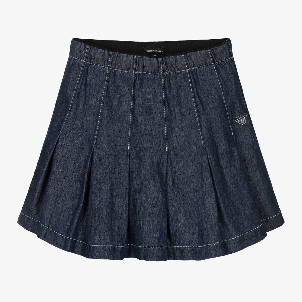 Cool and casual, this dark blue chambray skirt for teen girls is by Italian label Emporio Armani. Closely resembling denim, this timeless design has an elasticated waist and a pleated silhouette. This is further defined with contrast topstitching. The brand's iconic Eagle logo patch can be seen on the front for a subtle designer detail. It is made in a lightweight cotton and linen blend and fastens on the side with a concealed zip.