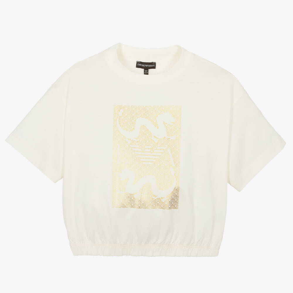 Renowned luxury brand Emporio Armani designs this ivory short-sleeved T-shirt for teen girls. A style to celebrate the Lunar New Year, the front features a shimmering gold foil dragon and logo graphic. The cotton and lyocell-mix fabric, dropped shoulders and elasticated hem allow for a cool, flattering silhouette.