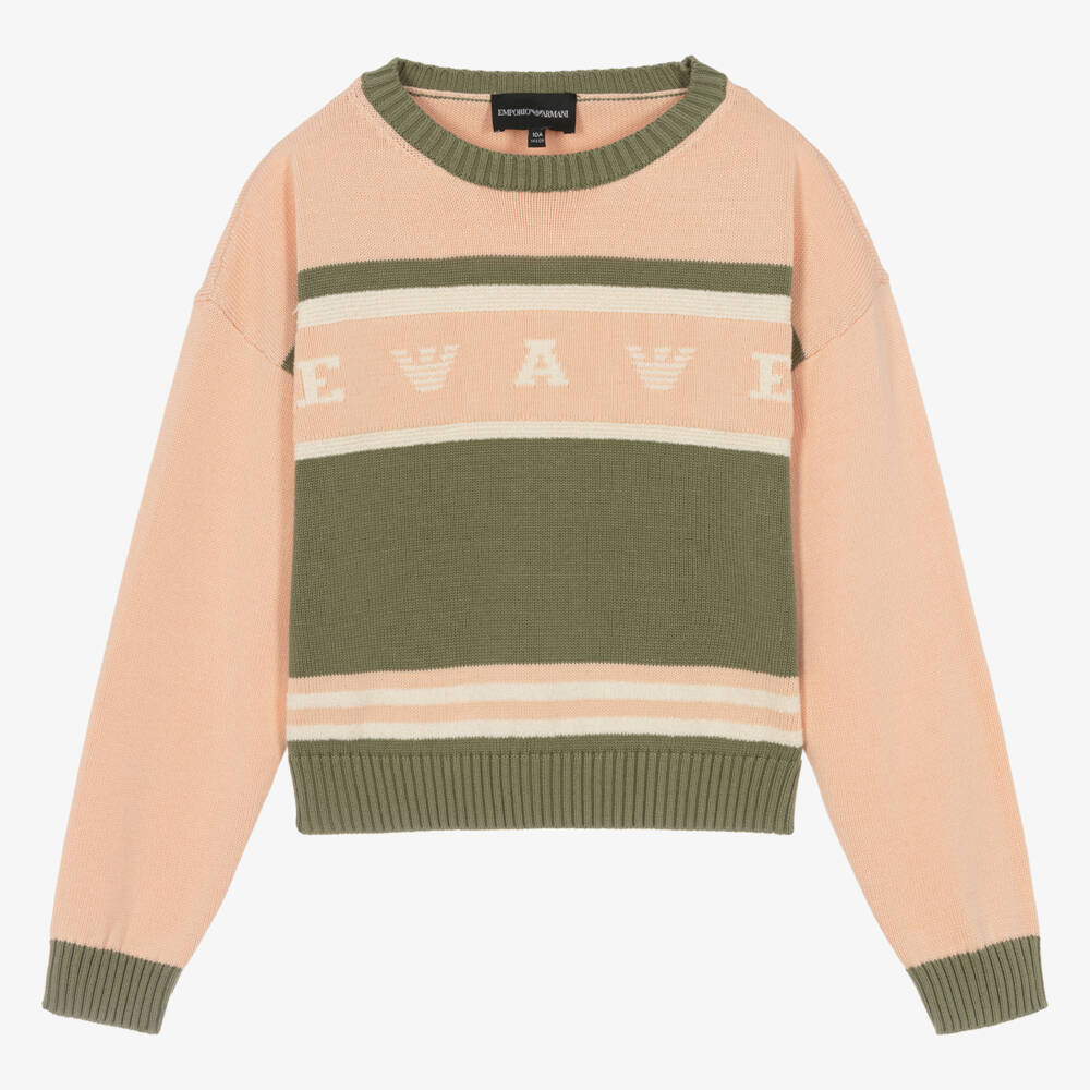 A pale pink sweater by Emporio Armani for Teen girls, with a stylish ivory Eagle design across the chest for instant brand recognition. Beautifully knitted in a soft and cosy cotton yarn with lightly ribbed trims. This laid back top has contrasting green stripes and sits neatly on the waist.