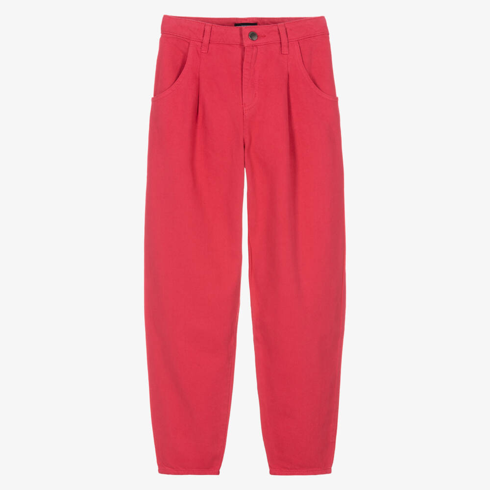 Dark pink trousers for teen girls by Emporio Armani, with a metal Eagle logo plate on the back for a recognisable designer detail. Shaped with darts on the leg, they have useful front and back pockets for storage. Made in soft mid-weight cotton, they fasten with an embossed button and zip on the front.