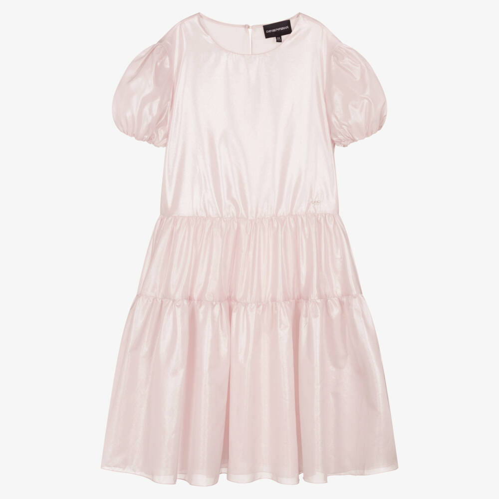 A stunning pale pink dress for teen girls by Italian designer Emporio Armani, with an eye-catching Eagle logo charm on the waist. This silk dress has a luxurious shimmering effect, with voluminous tiers and elasticated puff sleeves. Adding a touch of elegance, there is an open loophole button fastening, effortlessly zipping up at the back.