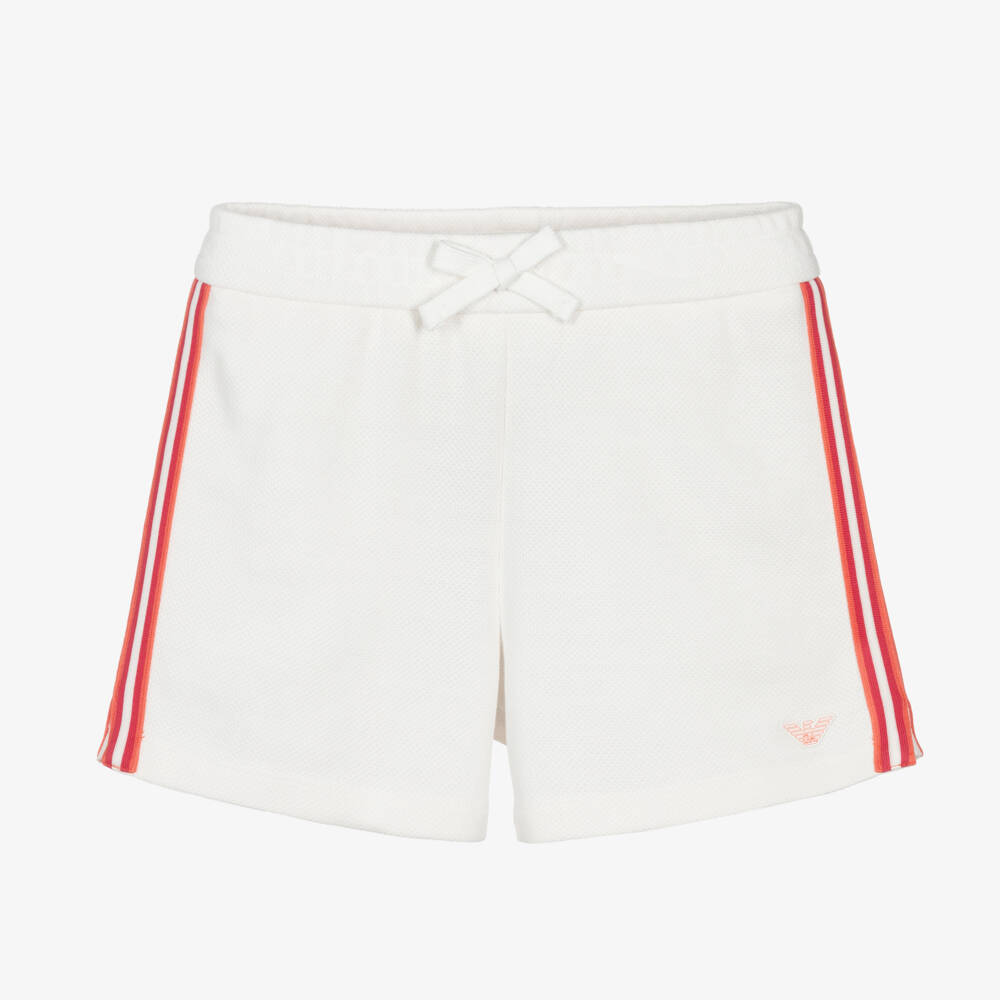 Casual with a sporty vibe, these off-white cotton shorts for teen girls are from Emporio Armani. Part of the EA Crew capsule, they have stylish striped side trim in red and orange and a rubberised Eagle logo badge on the front hem. This comfortable and easy-to-wear style has an elasticated waistband with a decorative bow detail and is made in soft waffle jersey.