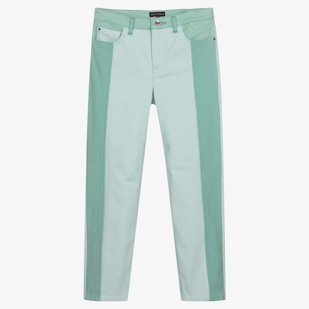Green jeans for teen girls by Emporio Armani, made in soft cotton denim. They have a cool colour block in shades of mint green and the Eagle logo charm on one back pocket. There's further detailing with a brown logo-embossed patch on the back of the waist. With classic five pocket styling, they have a useful adjustable waist.