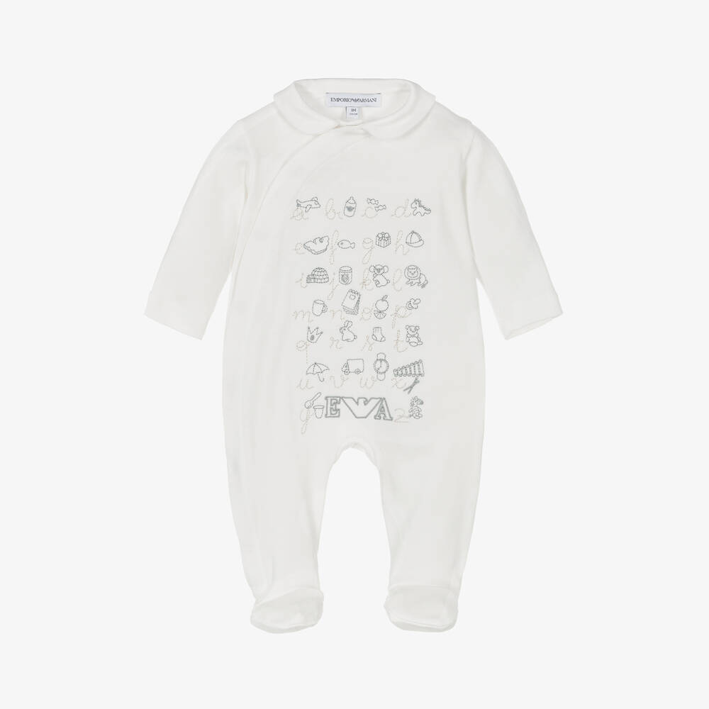 A lovely off-white babygrow for boys and girls by Italian brand Emporio Armani. The front has an adorable alphabet display embroidered in blue and beige, incorporating the brand's logos for a designer touch. Made in comfortable cotton jersey, this sweet babysuit has an asymmetric popper fastenings down the front to help with dressing.