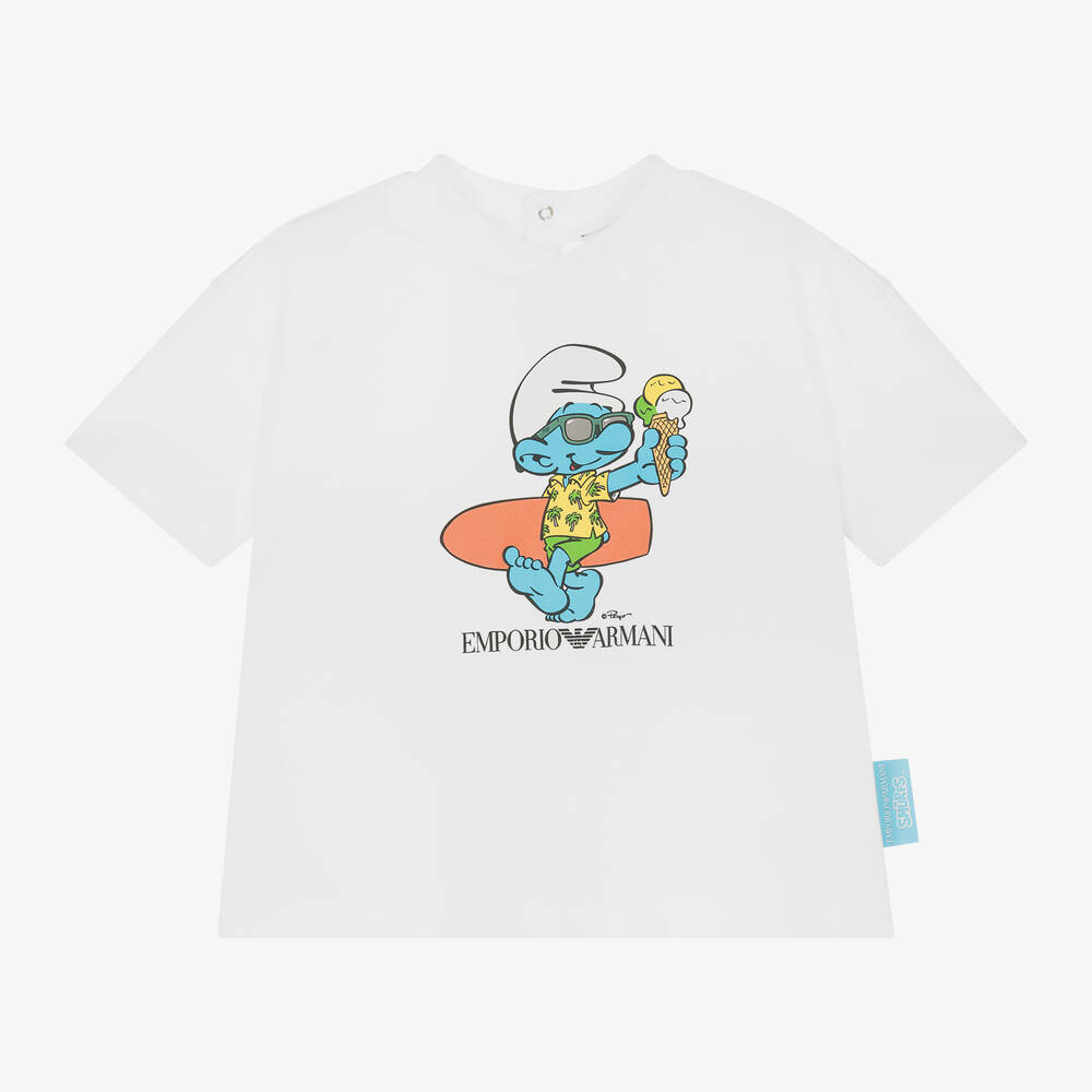 Off-white T-shirt for baby boys and girls from Italian designer Emporio Armani, with a blue collaboration label on the side. Full of character, this short-sleeved T-shirt is enhanced by the print of the iconic blue Smurf eating an ice cream and holding a surfboard. The brand's sleek logo graphic beneath adds that luxury detail. The ribbed neckline is designed in a comfortable cross-over style on the front and there are branded Eagle poppers to fasten on the back. This garment contains organic cotton.